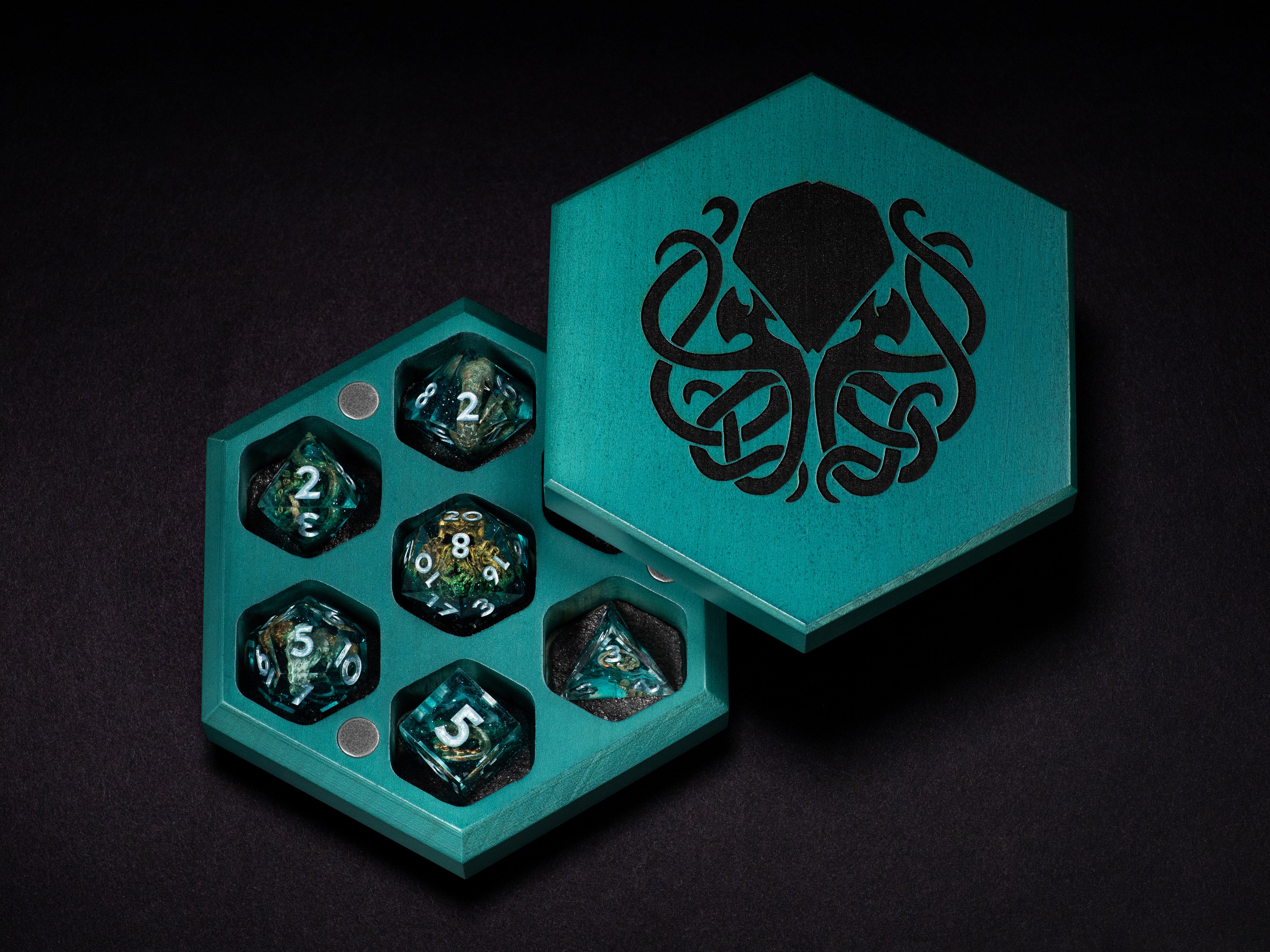 Our dice are handcrafted from high-quality epoxy resin, which allows us to create beautiful, durable, and unique designs for every set.